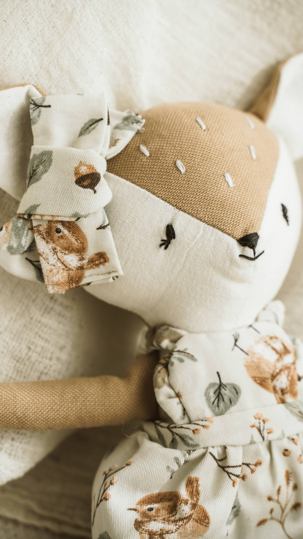 Cada detalle está pensado con amor: desde su cuerpo blandito hasta sus vestiditos en lino o algodón, Aurora invita a crear historias, soñar y acompañar a los niños en cada aventura cotidiana.