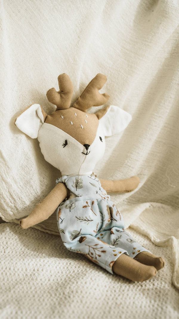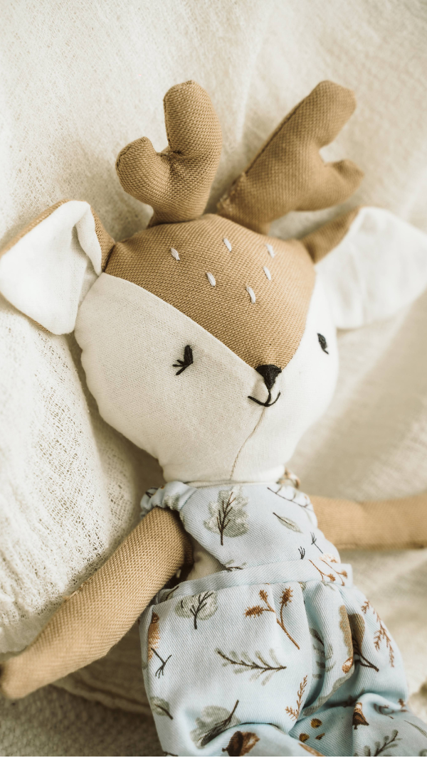 Bambi Elio es un compañero encantador, lleno de ternura y suavidad, pensado para ser parte de cada rincón del hogar y de cada momento de magia e inocencia. Hecho con telas cuidadosamente seleccionadas y confeccionado a mano con dedicación, Elio refleja el espíritu de nuestra colección: natural, acogedora y llena de sensibilidad.